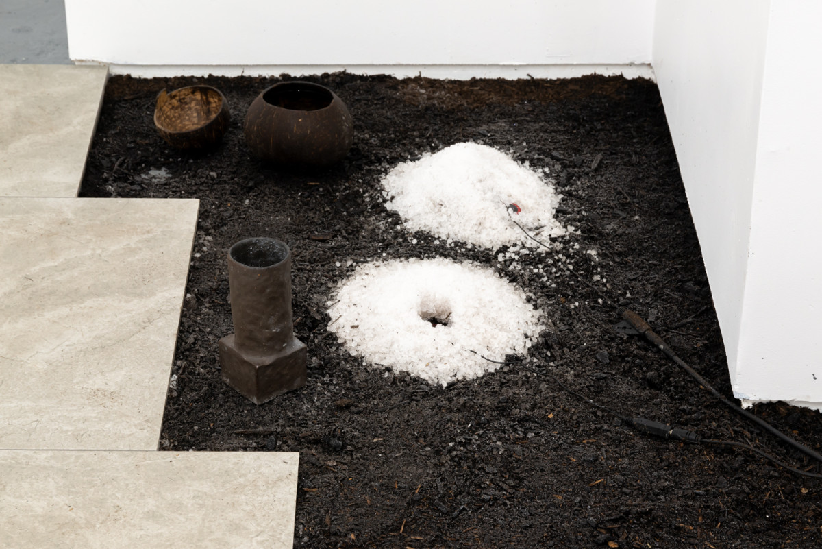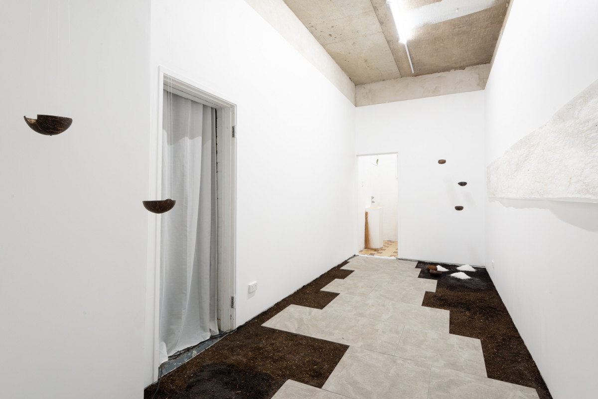 Functioning as a transitional space—a threshold or portal—the gallery space is reimagined as a sacred site through which one moves from one state or realm to another. At both entryways to the gallery, a leaf with a hole hollowed out of its centre hangs in the doorframes. Traditionally, these magical leaves are used to ward off a great serpent, a mystical being invisible to the naked eye. The hole in the leaf—known as ‘bogaboga’— functions like a lens, allowing one to glimpse the serpent’s hidden form. In the ritual of ‘ḡaumaḡauma’, a protective rite, the leaf is ceremonially waved twice to the right and twice to the left, a gesture that prepares the body for passage and shields it from unseen forces.