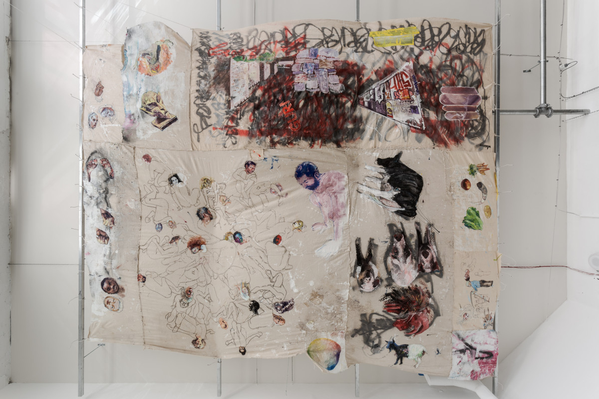So the work that I’m doing for the show are all of these drop sheets for painting houses, some used some not. Im kinda stitching them all together but working on them separately beforehand to sketch the different panels out. And the panels are kinda as disparate in application/technique and subject as all the other shit I’ve been doing, there’s one thats like this nude model and its like 30 of him tumbling around and then another one is all animals and then theres one of objects and still lives etc…I’m frustrated about how to pull imagery together, not ideas idk, its hard to explain perhaps on the phone.