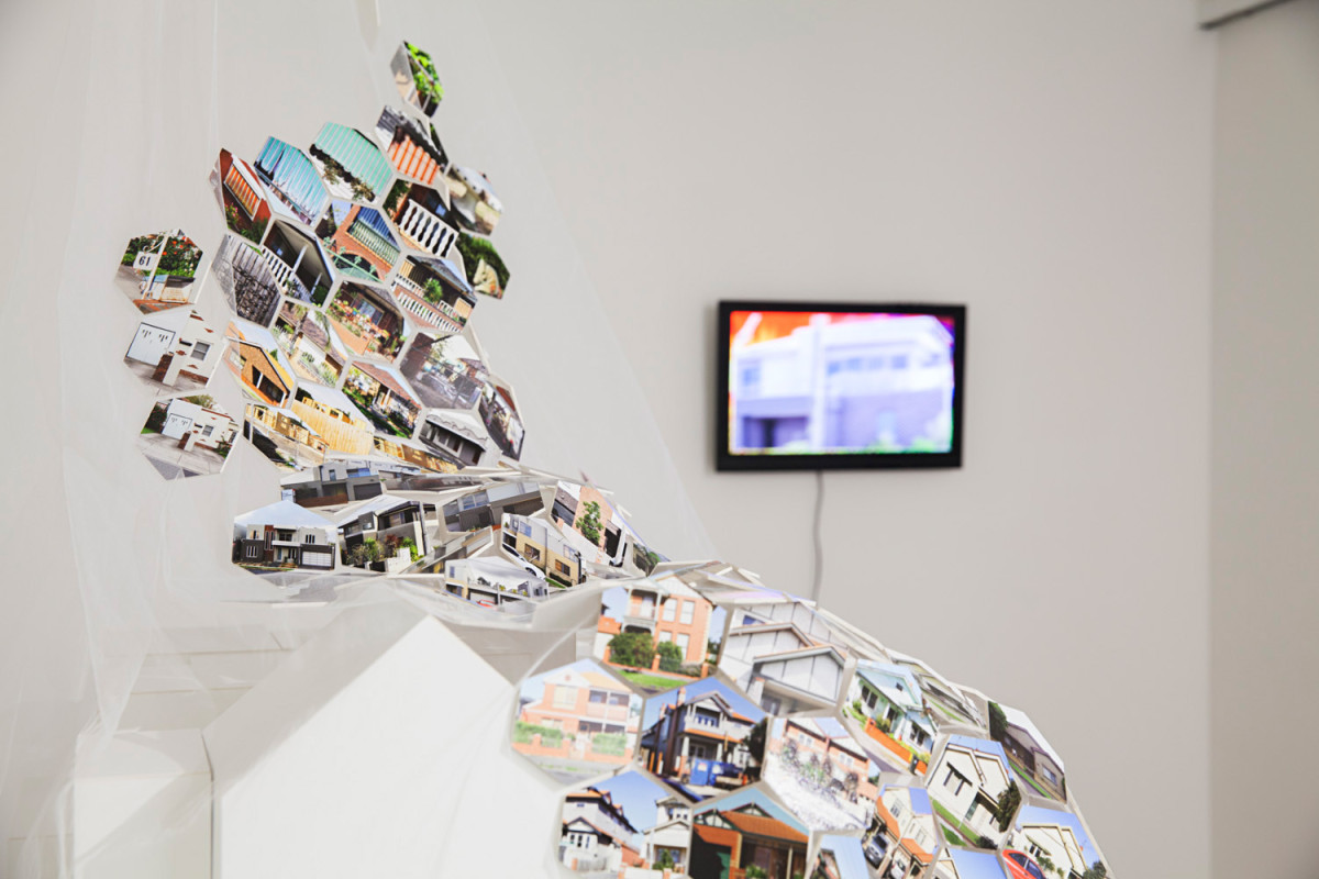 ‘Multidwelling’ displays the changing texture of Melbourne’s streetscape, as the great Australian dream shrinks and a denser Australian ugliness increases. Strange outcroppings of brick, timber and stone veneer, with unblinking aluminium-framed eyes, rise up in the wake of every bungalow demolition. Will they last long enough to accrete their own cultural capital? Should they? Is our addiction to tasteful, detached period homes a greedy, first world indulgence, and yet another manifestation of climate crisis denial? Or do we risk losing the fragile membrane of social memory and identity that our built environment focuses and coheres? ‘Multidwelling’ raises these questions, connecting them to the fraught position of the independent arts scene, itself mired in the real estate market, tethered to the architecture of the white cube.
