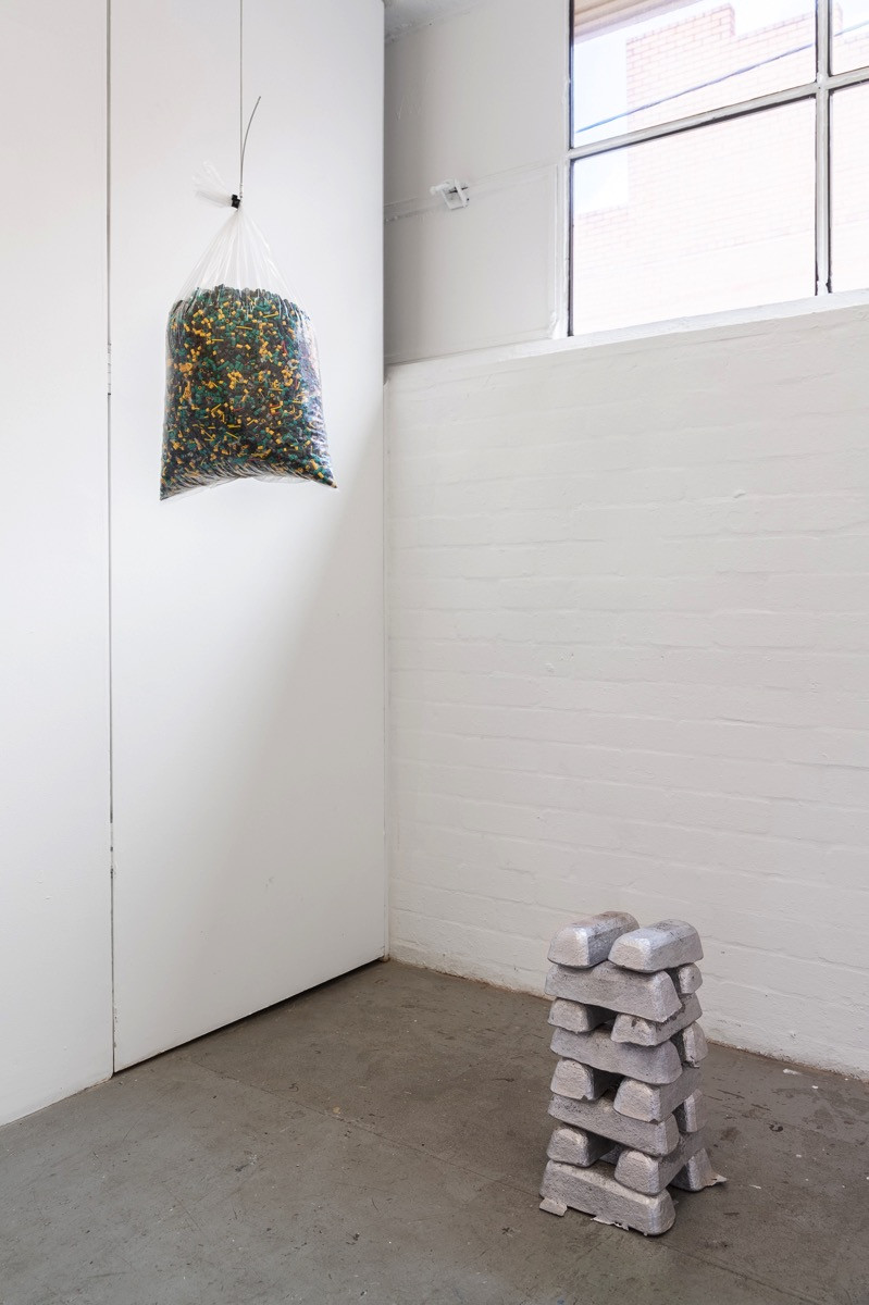 The work exhibited at Bus Projects is Part 3 of ‘Limits to Growth’. With development of new sculptural forms, Nicholas Mangan continues to explore the themes of circular economies. By manually breaking down the components of the now obsolete Bitcoin mining machines used in the first two stages of the project the artist created aluminium bullions of recycled “e waste” which act as a new hard currency. In addition, the cut wires from the mining rigs can be read as transmitters of energy and currency flows, a residual material connecting the three parts of the project.