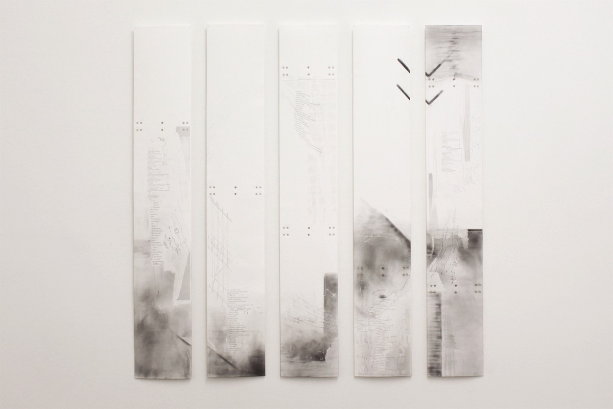 Hill draws on a repeated ritual of her practice in which vocabularies of marks are stored through the incidental rubbing of copper plates located in her backpack during walks. This series aligns to Bogong Village, Victoria where she recently undertook a residency. For Kotlarczyk, traditions of marginalia and research into the body politic inform a suite of sculptural, contoured visual poems that notate responses to various public conversations being had over a five-month period is 2015-16.