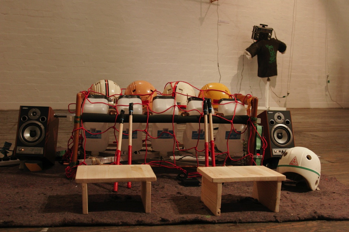 The curatorial brief for this exhibition specified the construction of ‘physical objects with sonic potential’. In recent years there has been a renewed interest in object-based sound art, and a generous enthusiasm for the crafty materiality of sonic contraptions. Sound artists in this context are also builders and architects; works are constructed according to the specific properties of materials and acoustic specifics of locations. The link between the materiality of objects and the materiality of sound as it physically moves through the air becomes a source of wonder for makers and listeners alike.
