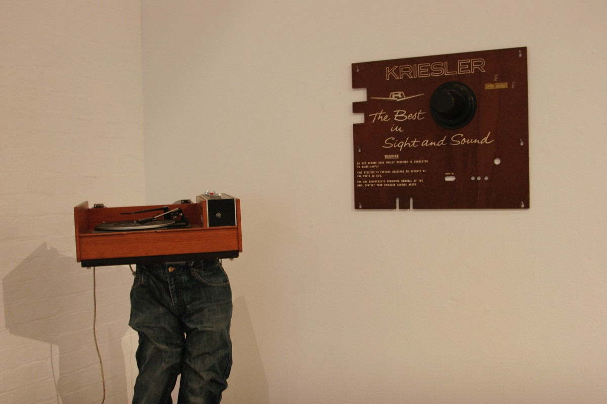 Various media including clothing, plaster, metal, speakers, turntable, fridge parts and sound