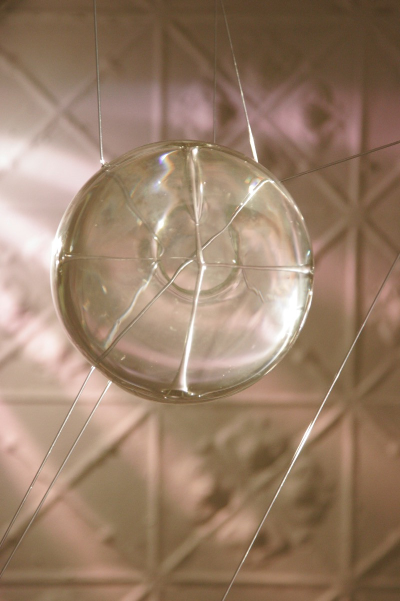 Piano wire, steel cable, cello bows, nylon filament, blown glass, water, wall fixtures and sound equipment.