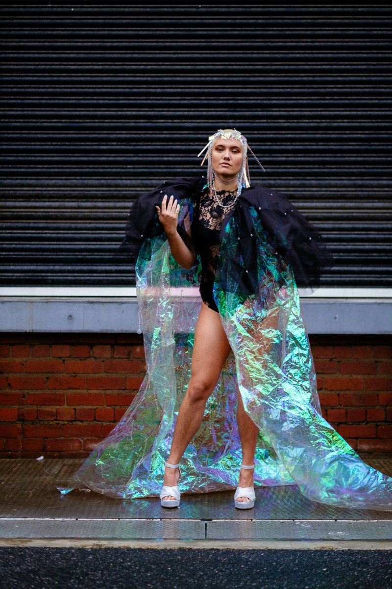 ‘Water is the driving force of all nature’. In this piece we explore water and its relationship with us from birth, we begin our lives from the sacred watering hole of our mothers belly. The power of water is vital to our everyday lives and the existence on this earth. Using up-cycled plastics we have created a ‘Mother of Water’ cape which has drops of water connected to an iridescent sheet of fabric. Black tulle shoulder accents to show strength and a beautiful Warrior goddess headpiece made from recycled pieces of iridescent acrylic.