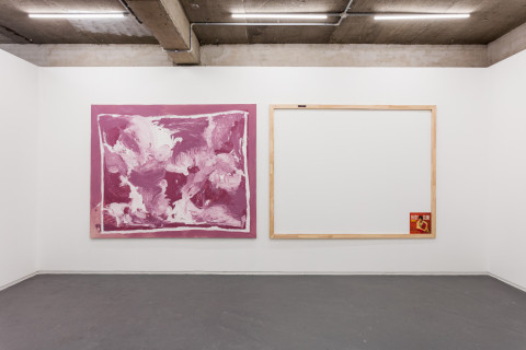 Acrylic paint on glass with wooden frame and paper