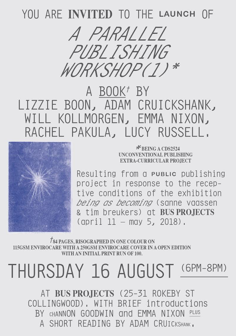 Join us for the launch of “A Parallel Publishing Workshop (1)”. The book is the result of a three-week live publishing action by Adam Cruickshank and Unconventional Publishing students (Monash University) Lizzie Boon, Will Kollmorgen, Emma Nixon, Rachel Pakula, Lucy Russell at Bus Projects in response to the receptive conditions of the exhibition “Being as Becoming” featuring artists Sanne Vaassen and Tim Breukers and curated by Freek Lomme, Director of Onomatopee, Netherlands.