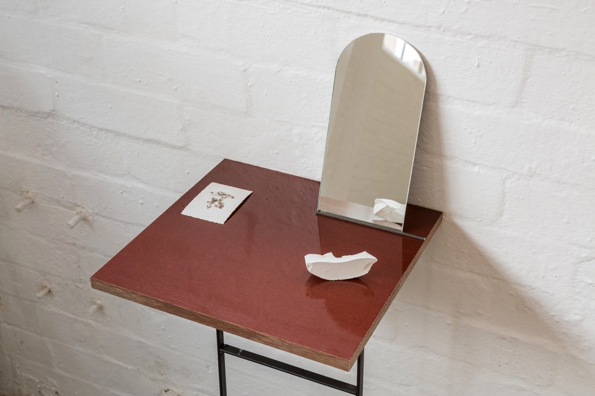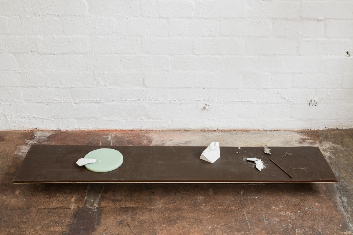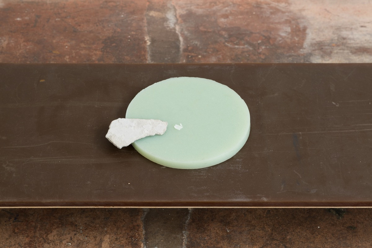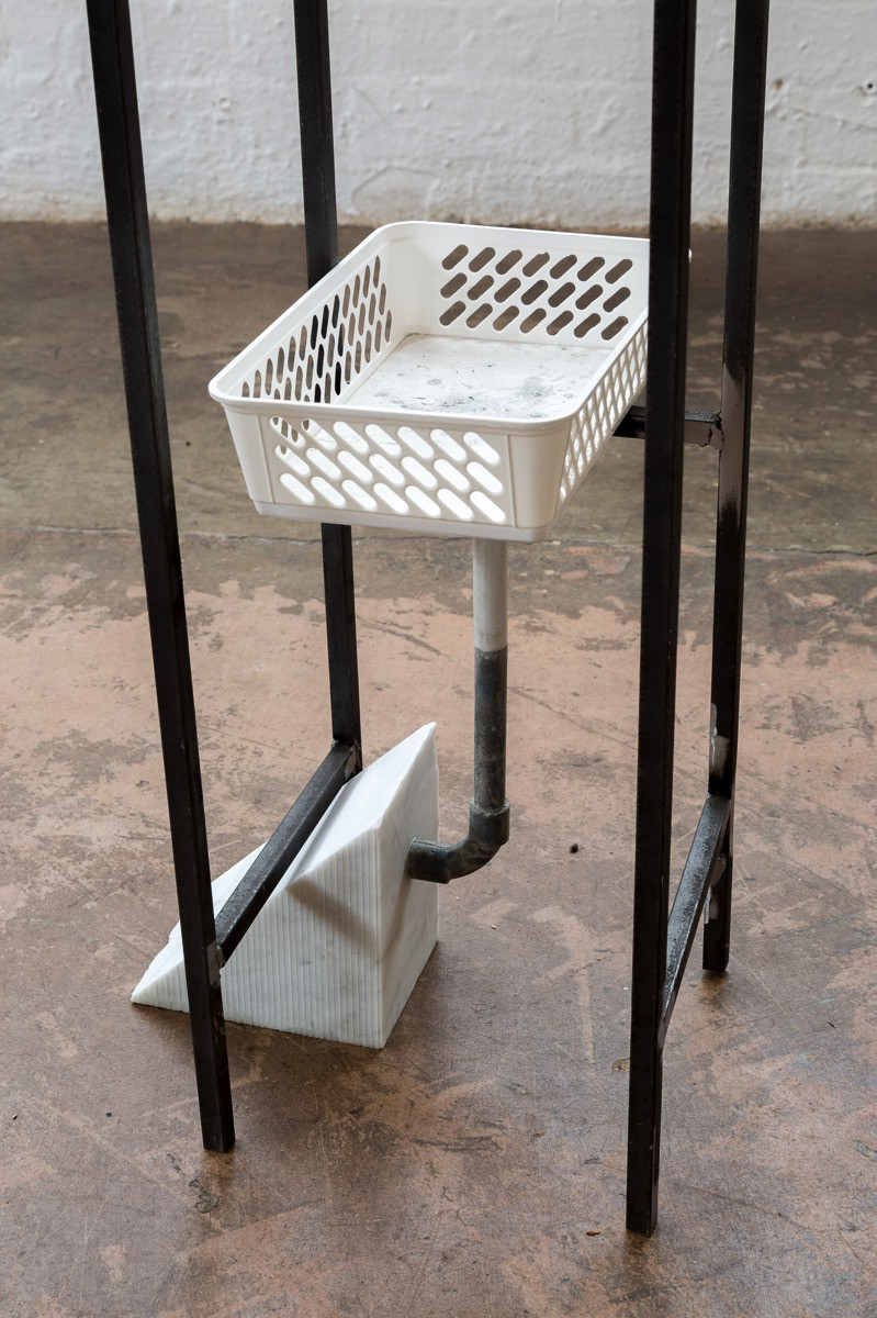 These allegorical histories formed the starting point of this exhibition, which was made as a series of material experiments using steel, cement, paint, bread and more bread, bronze, marble, nylon and glass. The simple act of casting an obdurate material like cement with bread produced a fallible form, fragile and time sensitive.