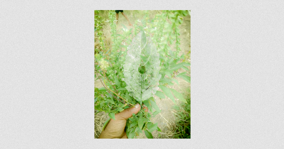 A close-up photograph of someone holding a bunch of wild basil in their hand. In the top left corner is someone’s legs. Overlayed is an image of a wild basil leaf with a hole extracted from its centre. Photo Credit: Gemona Kila (my (Ansell’s) aunty).