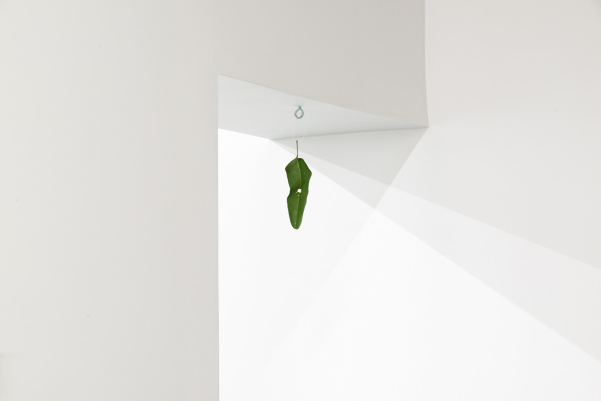 Functioning as a transitional space—a threshold or portal—the gallery space is reimagined as a sacred site through which one moves from one state or realm to another. At both entryways to the gallery, a leaf with a hole hollowed out of its centre hangs in the doorframes. Traditionally, these magical leaves are used to ward off a great serpent, a mystical being invisible to the naked eye. The hole in the leaf—known as ‘bogaboga’— functions like a lens, allowing one to glimpse the serpent’s hidden form. In the ritual of ‘ḡaumaḡauma’, a protective rite, the leaf is ceremonially waved twice to the right and twice to the left, a gesture that prepares the body for passage and shields it from unseen forces.