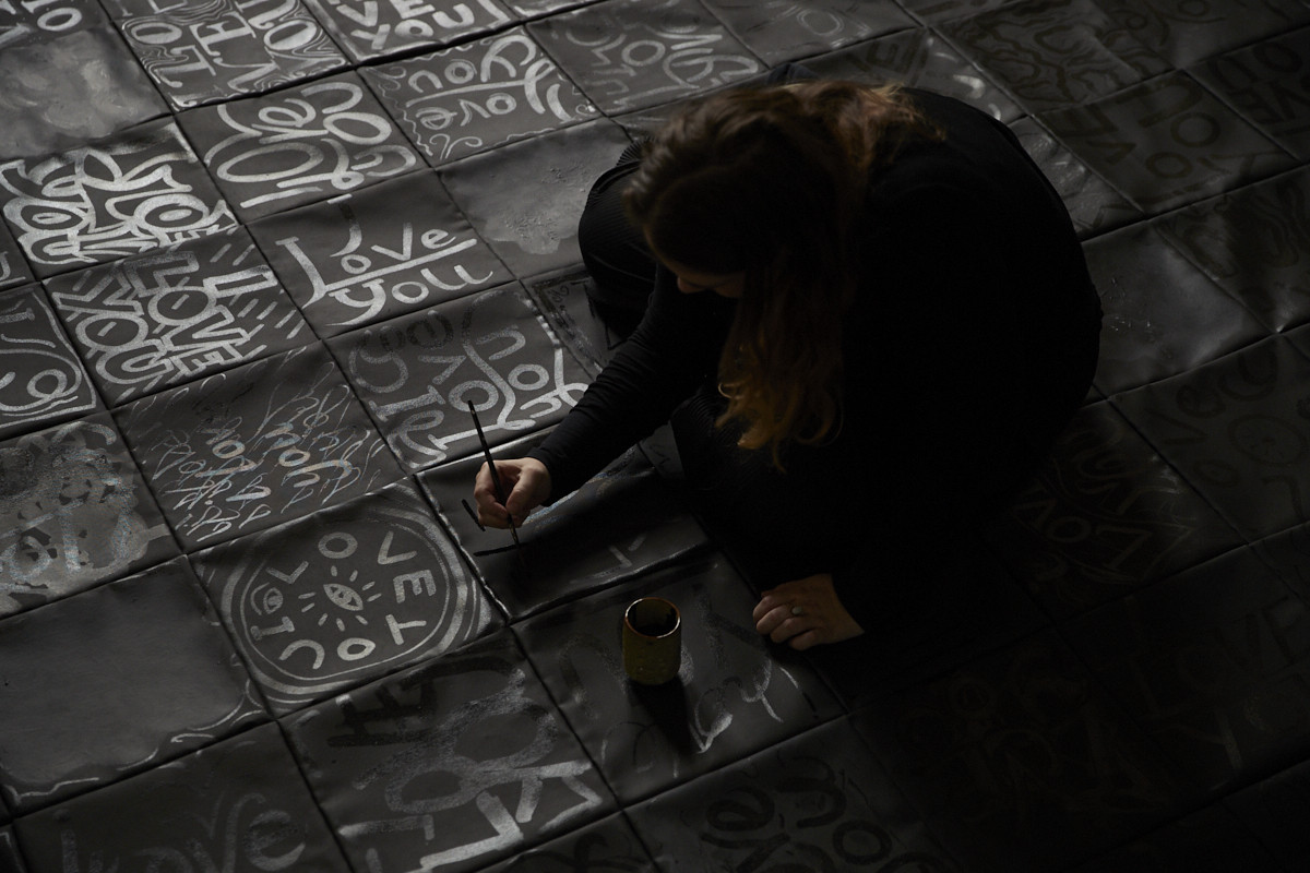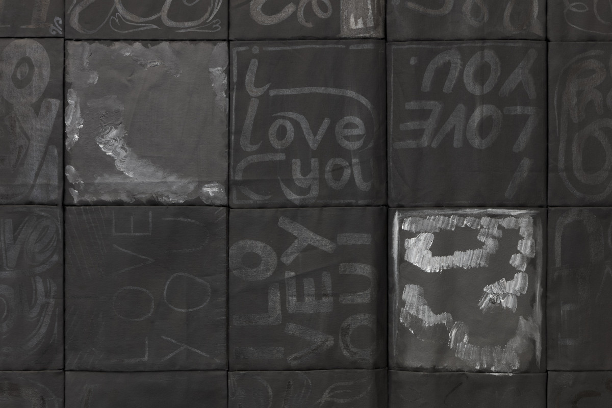 In Memory is inspired by the at once deeply personal and yet collectively shared experience of grief, loss and mourning. Monumental in scale, In Memory is made up of over 200 canvas squares cut to standard quilting size and sewn together to construct a large painting. Each square is intricately and individually designed using sign writing techniques, repetitive graphics and decorative motifs. Drawing on the tradition of mourning quilts; large handmade textiles to express and commemorate both personal and community grief, In Memory is a meditation on the complexity of grief, the inevitability of change and the ongoing process of life.