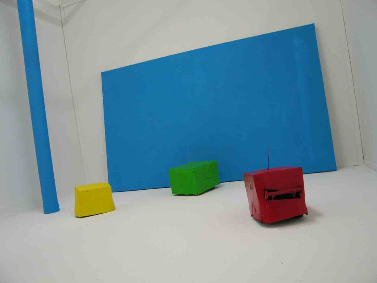 The work is made from painted cardboard boxes placed casually on top of remote-control cars, which perform different functions in a studio environment. I am using these forms to animate the play of light and colour in the shifting relationship between the actual and the representational. This allows the mobile object to become a type of moving colour field behind the frame of the camera screen. In some instances these moving boxes become the instrument used to paint. I want to make a “moving painting”, and this depends on the moveable object’s navigations through space.