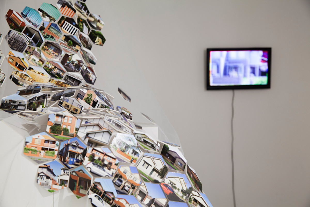 ‘Multidwelling’ displays the changing texture of Melbourne’s streetscape, as the great Australian dream shrinks and a denser Australian ugliness increases. Strange outcroppings of brick, timber and stone veneer, with unblinking aluminium-framed eyes, rise up in the wake of every bungalow demolition. Will they last long enough to accrete their own cultural capital? Should they? Is our addiction to tasteful, detached period homes a greedy, first world indulgence, and yet another manifestation of climate crisis denial? Or do we risk losing the fragile membrane of social memory and identity that our built environment focuses and coheres? ‘Multidwelling’ raises these questions, connecting them to the fraught position of the independent arts scene, itself mired in the real estate market, tethered to the architecture of the white cube.